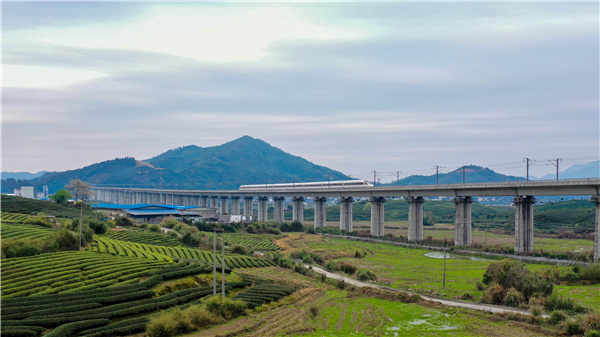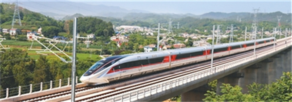 今年6月15日,全球最快高鐵CR450AF在試跑中通過(guò)滬渝蓉高鐵武漢至宜昌段龍泉河特大橋。李重慶攝(人民視覺(jué))